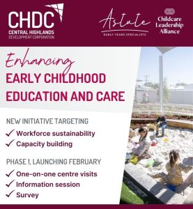 18 September, 2024: CHDC secured funding under the Grow Your Own (GYO) Regional Workforce Program Round 3, administered by Jobs Queensland through DESBT. The funding will support Phase 1 of the Childcare Leadership Alliance in the Central Highlands, which supports the primary focus on childhood education and care in Blackwater and Emerald.